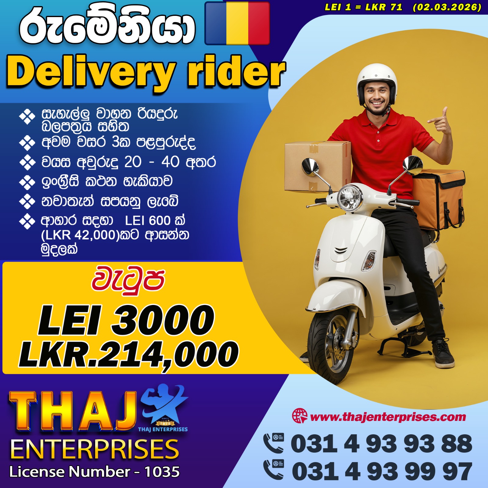 Salary : Lei 3000 රුපියල් 214,000/-