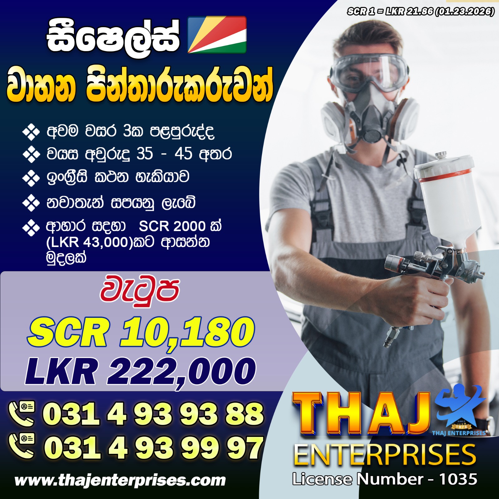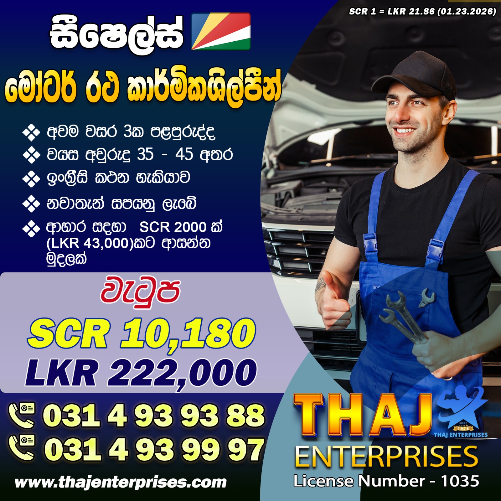 Salary : මුල් මාස 6 තුල SCR 15,300 (රුපියල් 314,000/-) පළමු මාස 6 ට පසු SCR 16,175 (රුපියල් 332,000/-)
