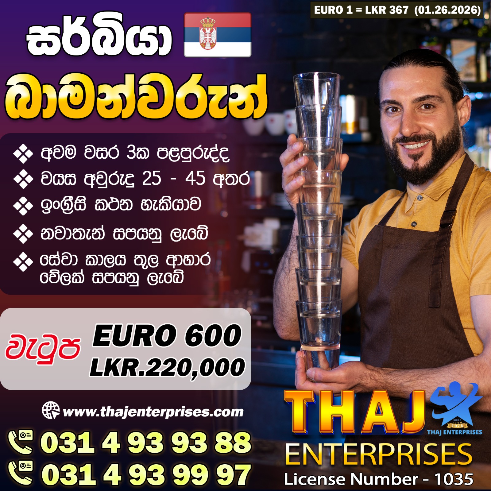 Salary : Euro 550 රුපියල් 192,000/-