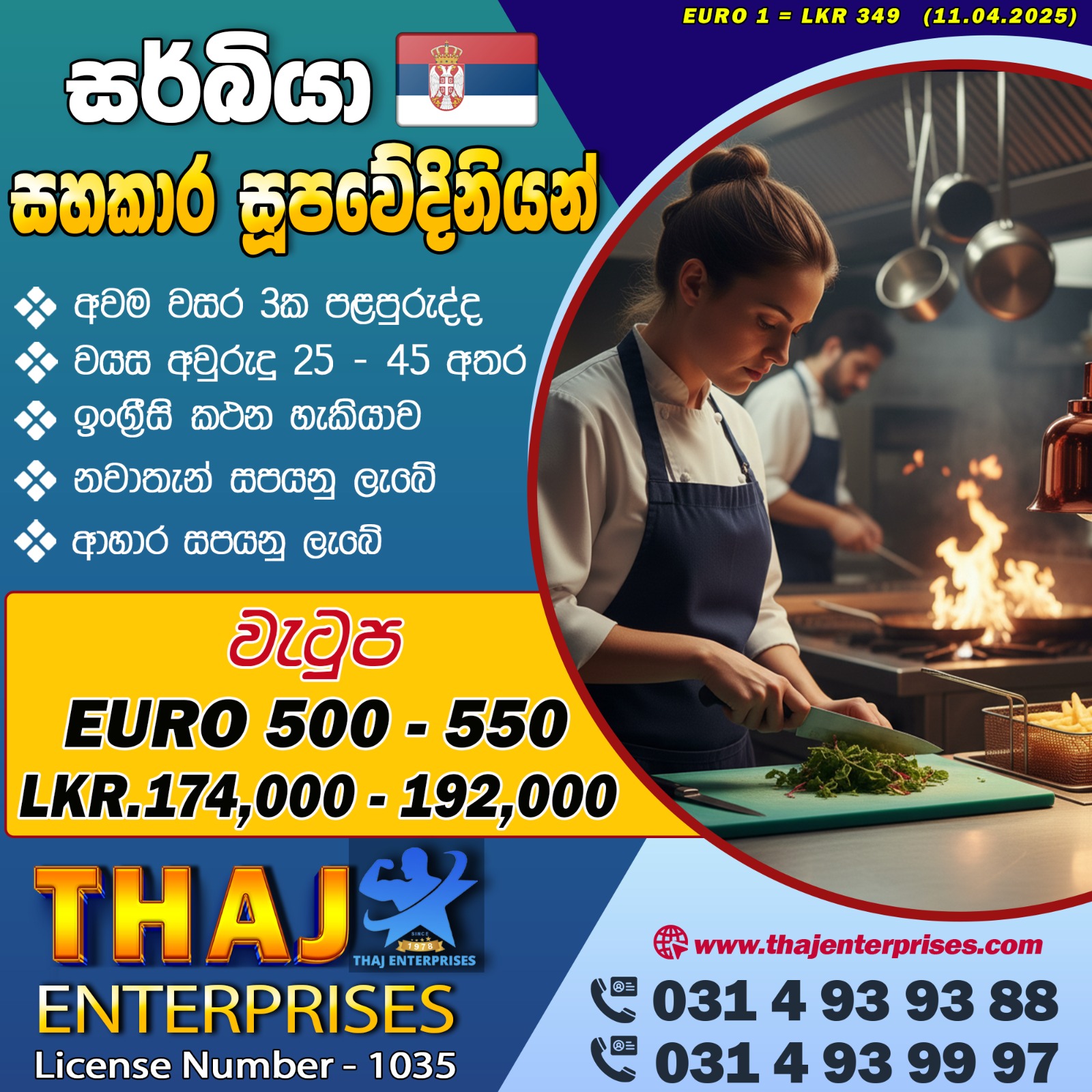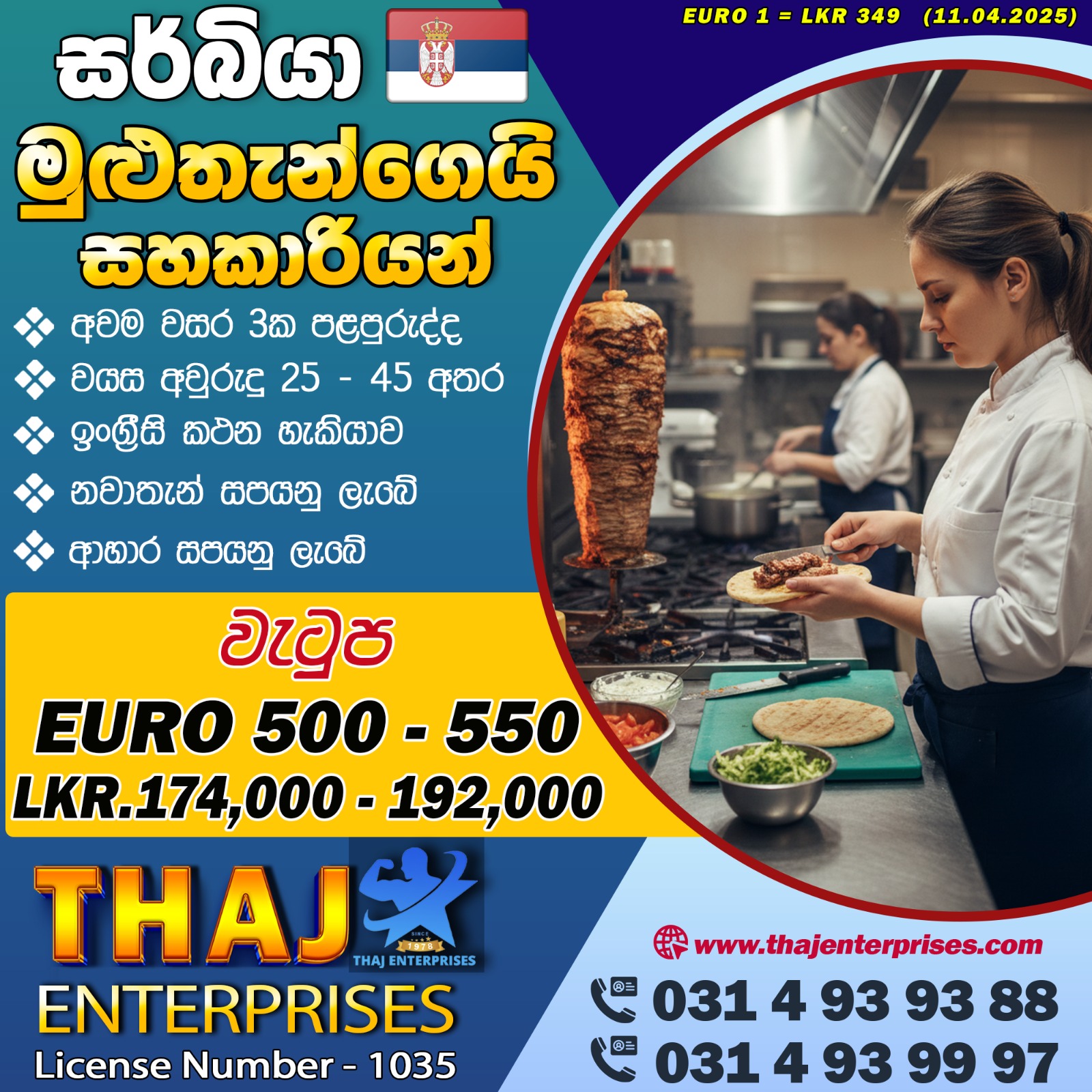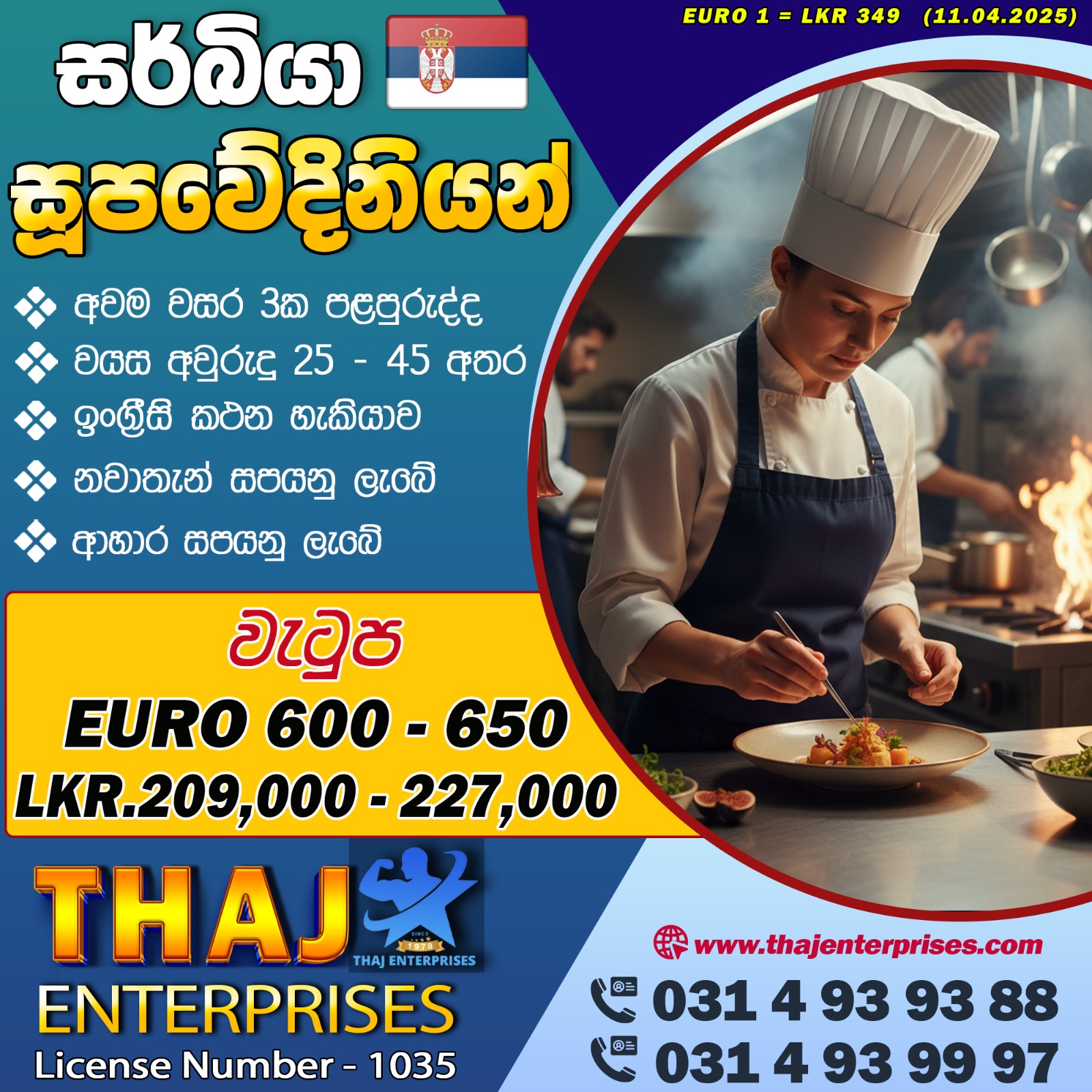 Salary : Euro 600 - 650 (රුපියල් 212,000 - 230,000/-)